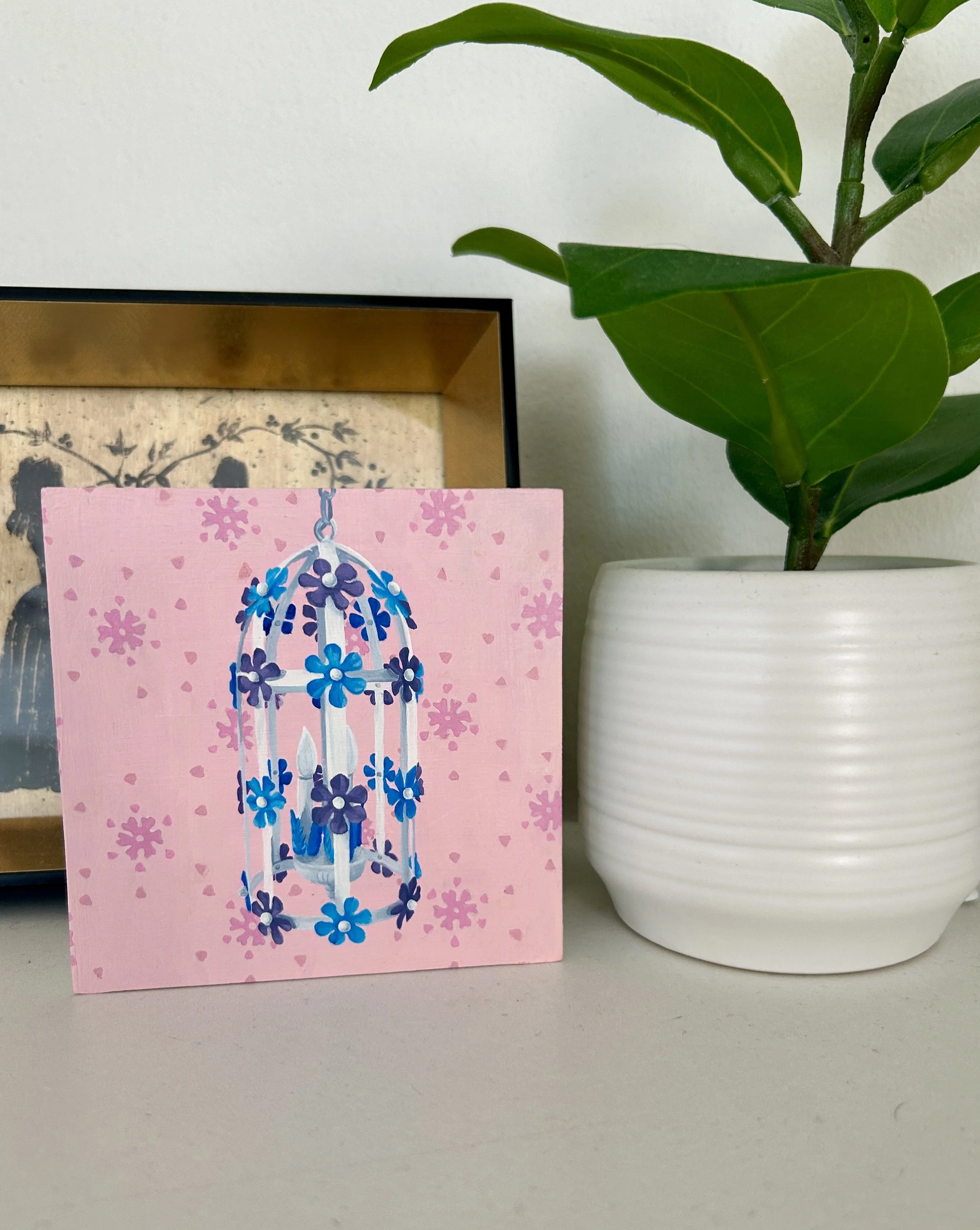 Slide 1 Slide 1 (current slide) Slide 2 Slide 2 (current slide) Daisy Cage IAcrylic paint on wood panel 4” x 4” x 1.5” (unframed)November 2024